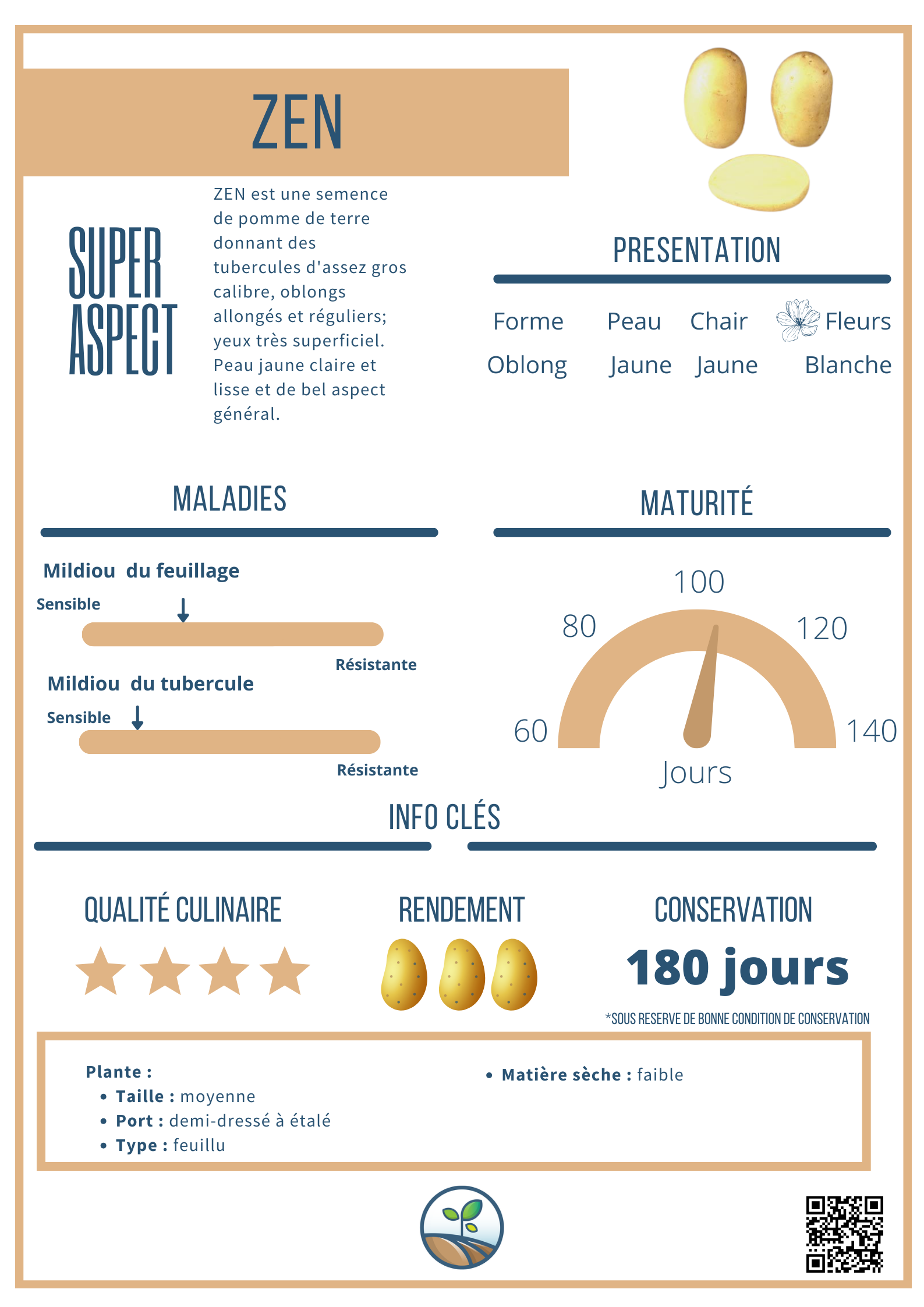 Zen est une variété de pomme de terre demi-précoce qui se distingue par une tubérisation assez rapide et une bonne proportion de gros tubercules. Elle combine de bons rendements, une excellente tenue à la cuisson, et une certaine tolérance à plusieurs bioagresseurs, ce qui en fait une option polyvalente tant pour les professionnels que pour les jardiniers amateurs.