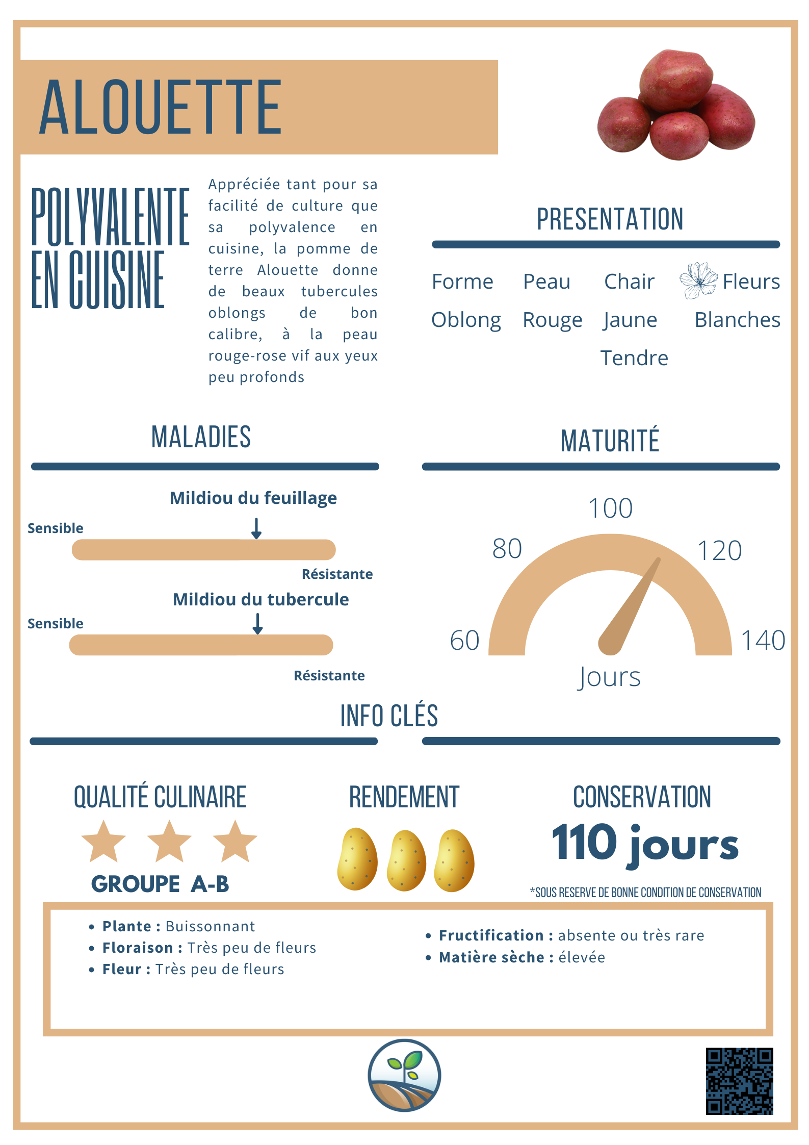 La pomme de terre Alouette se reconnaît immédiatement à sa peau rouge éclatante, tirant sur le rose vif, qui lui confère un aspect particulièrement attractif. Ses tubercules, réguliers et homogènes, révèlent à la coupe une chair jaune tendre, fine et savoureuse.