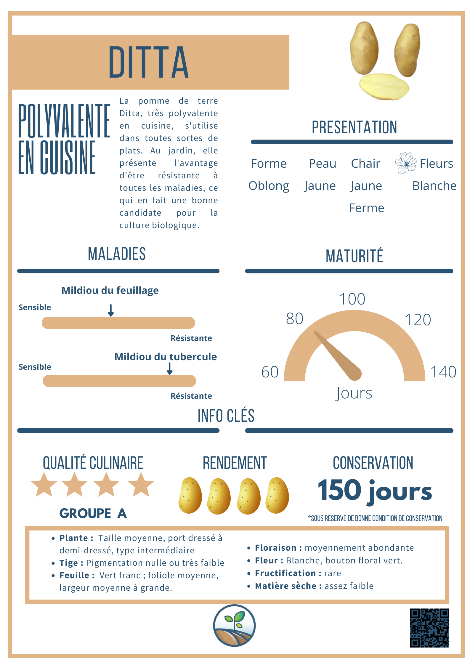 Cette variété à tendance à faire des tubercule de taille moyenne. Elle se distingue par une bonne conservation des tubercules récoltés.