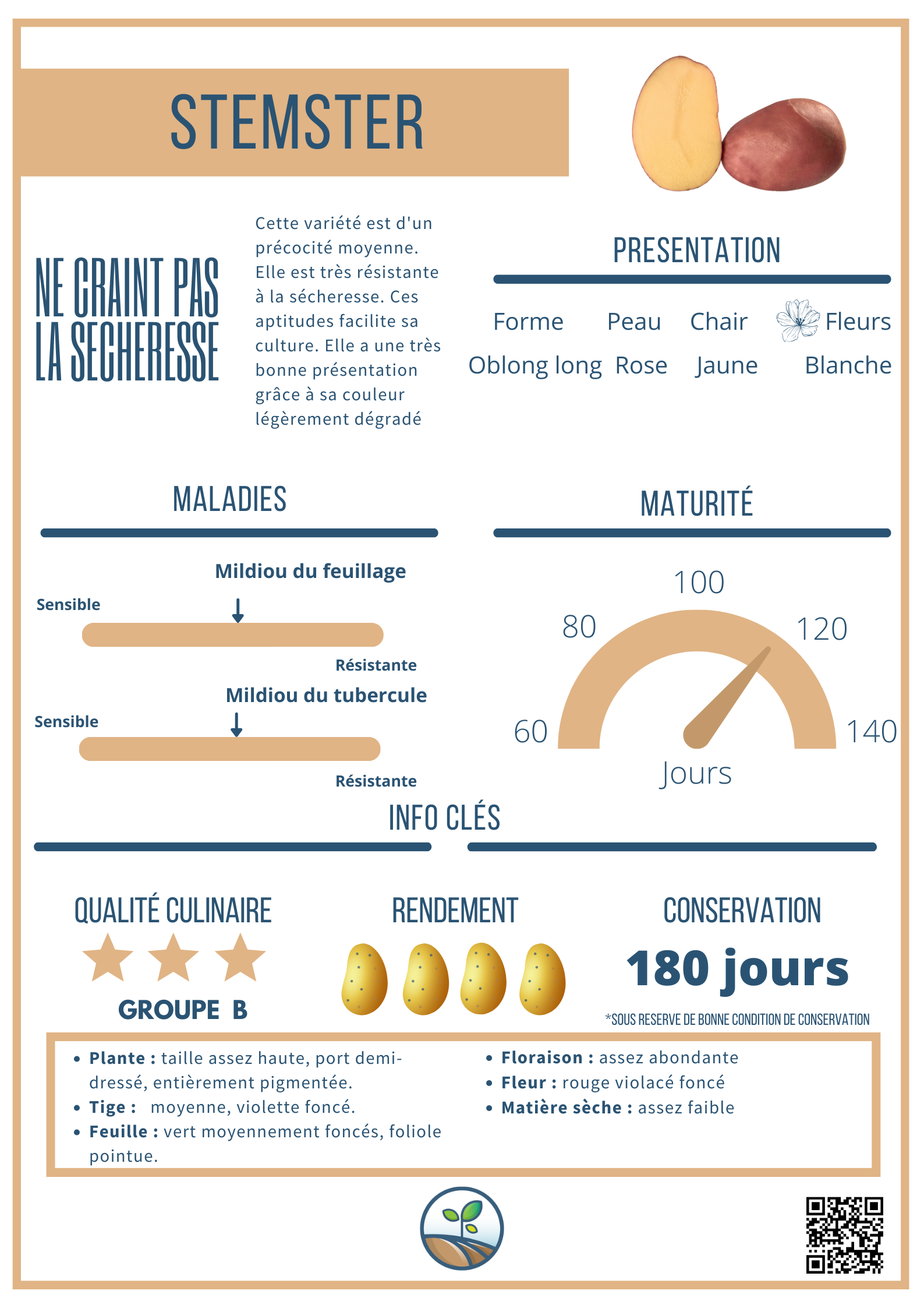 Cette variété polyvalente s’adapte à de nombreux usages culinaires : vapeur, four, gratins, ou encore rissolées. Facile à cultiver, productive et offrant une belle présentation, la Stemster est un excellent choix pour ceux qui recherchent à la fois le goût et le rendement.