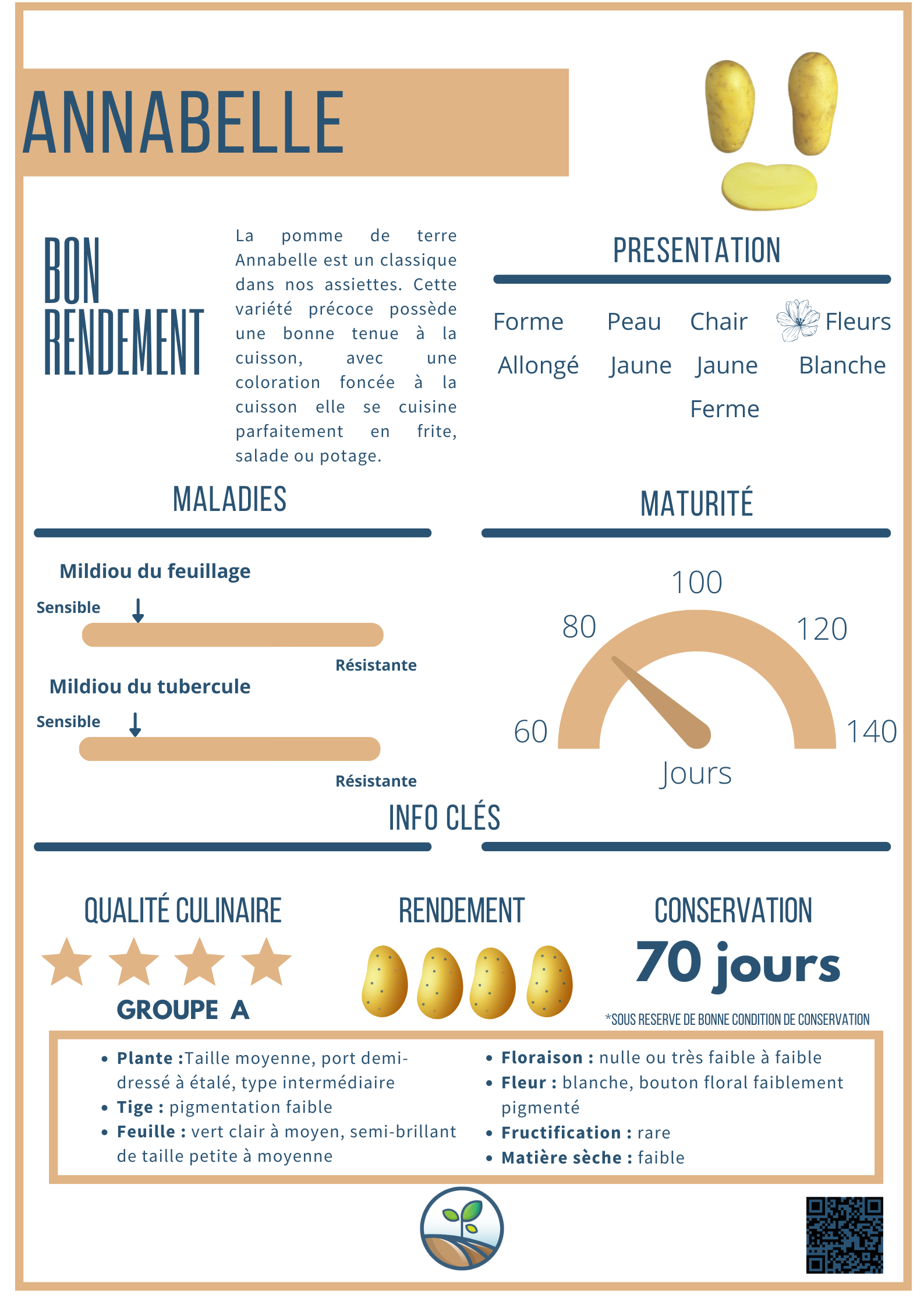 La pomme de terre Annabelle est un grand classique en cuisine. Très connue du grand public elle se cultive facilement et n'est pas exigeante au niveau des sols. Cette pomme de terre qui est une précoce donne en culture de nombreux tubercules avec un calibre moyen. Annabelle est donc une variété refuge pour ceux qui veulent allier performance, gout et rendement.