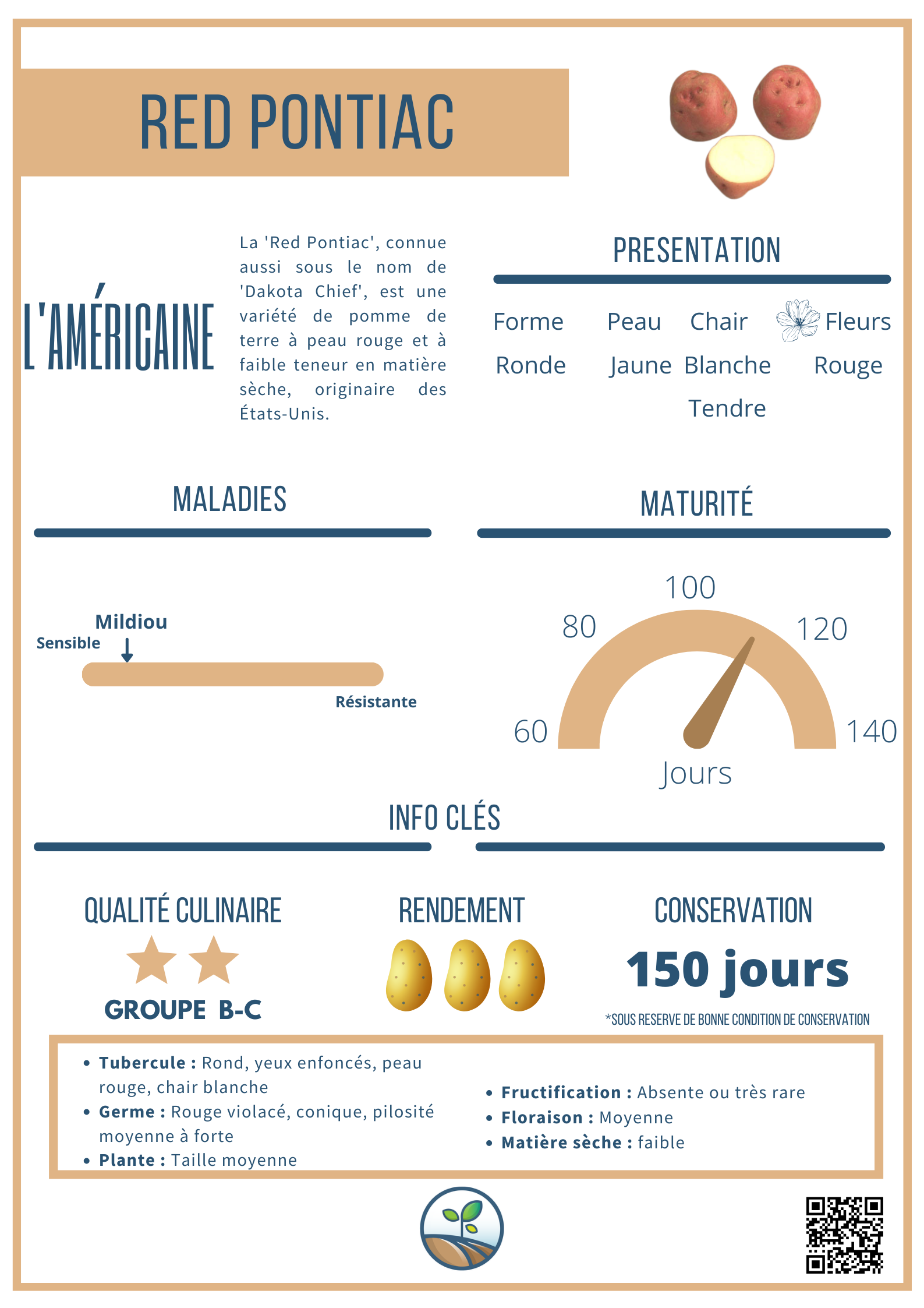 La Red Pontiac est une variété de pomme de terre venue tout droit des Etats-Unis. Cette variété à peau rouge et chair jaune à une faible teneur en matière sèche. Elle forme en culture des tubercules d'une taille importante qui ont une forme arrondie à oblongue. Cette variété est très sensibles aux différentes maladies mildiou et autres virus.