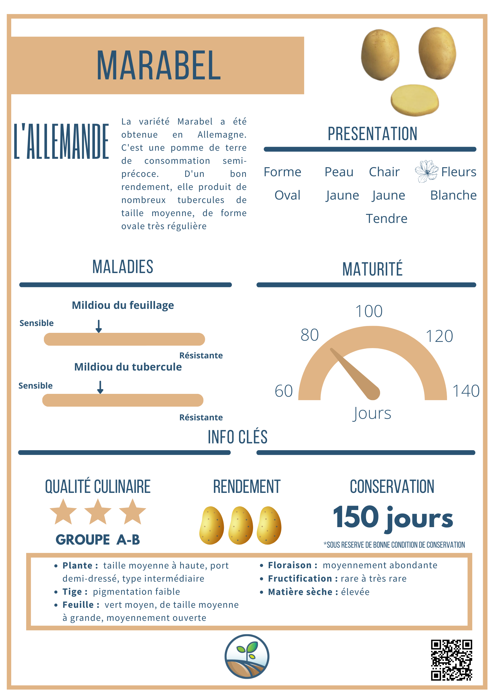 La pomme de terre Marabel BIO est une variété précoce, productive et savoureuse, produisant de beaux tubercules dorés à la chair tendre et parfumée. Elle est parfaite pour toutes les préparations familiales : purée, gratin, vapeur, poêlée et frites.